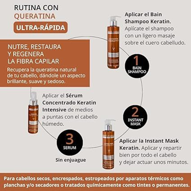 Champú con fórmula de queratina de acción ultra-rápida para reparar cabellos dañados por carga térmica (planchas, secadores, etc.). Reparación de la estructura queratínica de forma instantánea, finalizando en un cabello más flexible, brillante e hidratado. Restauración de la fibra capilar para devolver el estado natural y sano del cabello Indicado para cabellos encrespados, secos y castigados.